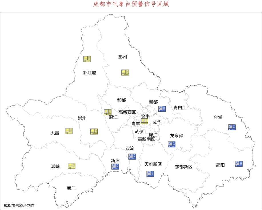 目前龙泉驿、新都、双流、新津、金堂、简阳、四川天府新区已发布大风蓝色预警信号,温江已发布雷电黄色预警信号,大邑、都江堰、彭州、邛崃、崇州已发布暴雨黄色预警信号,其余各区(市)县将根据天气形势及时发布预警信号。